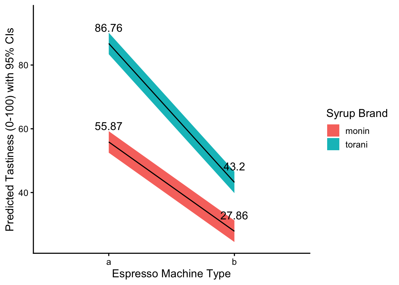 m’s predicted values for lattetastinesswith 95% confidence intervals, assuming those lattes were made withwhole milkand hadheartfoam art, but their only differences were themachinethat made them and the brand ofsyrupthey used.We see that lattes made from espresso machine B tend to be much less tasty than lattes made from espress machine A, given either type of syrup brand. Torani syrups see a sharper decrease than Monin syrups, but lattes made from Torani syrups remain much tastier.