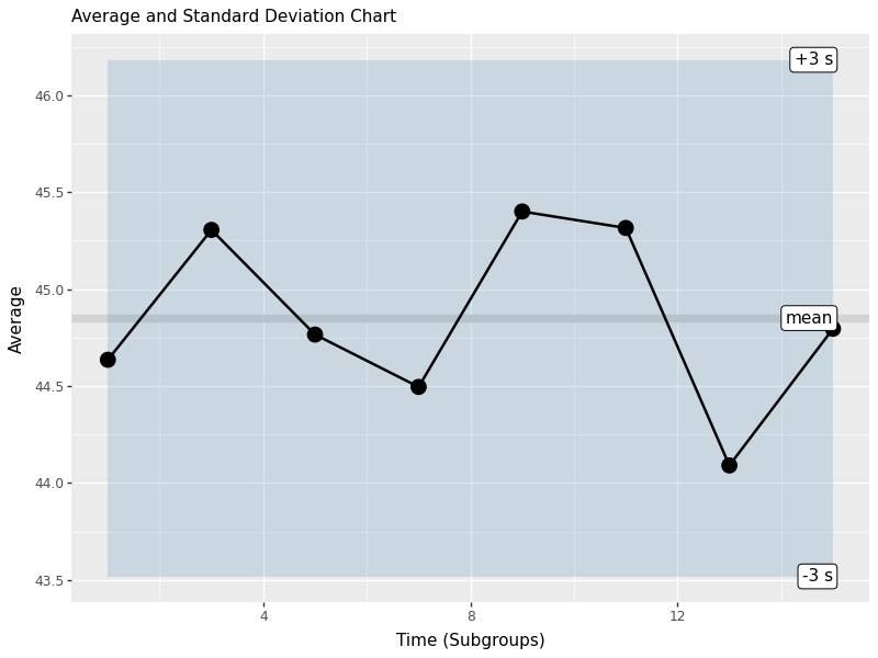 labs(x='Time (Subgroups)', y='Average', subtitle='Average and Standard Deviation Chart'))