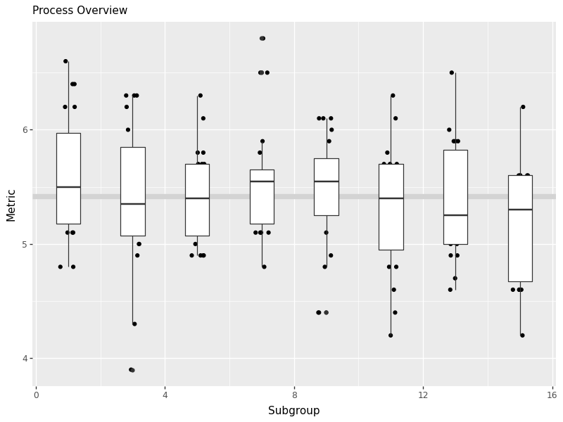 The process overview chart is one of the most important tools in SPC. It shows us how our process behaves over time, helping us identify patterns, trends, and potential issues. We’ll create a visualization that shows individual measurements, subgroup means, and the overall process average.