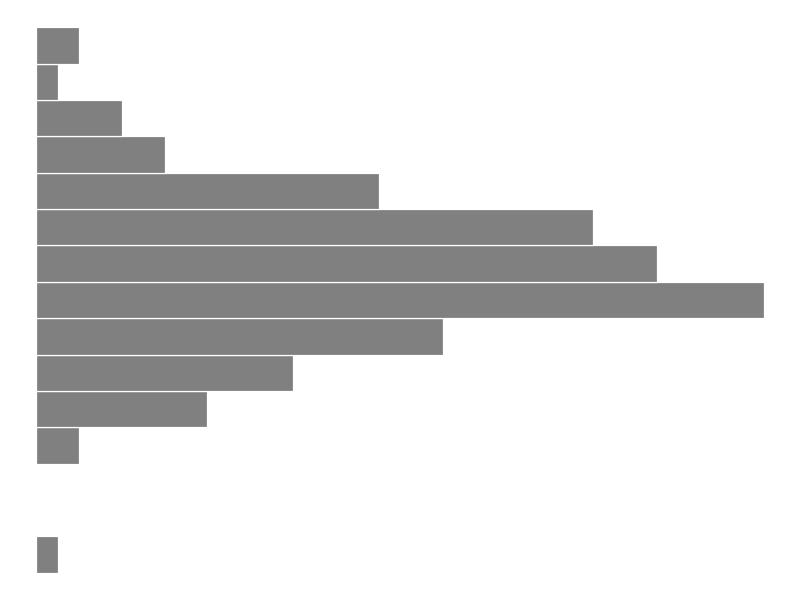 g2 = (ggplot(water, aes(x='temp')) + geom_histogram(bins=15, color='white', fill='grey') + theme_void() + coord_flip())